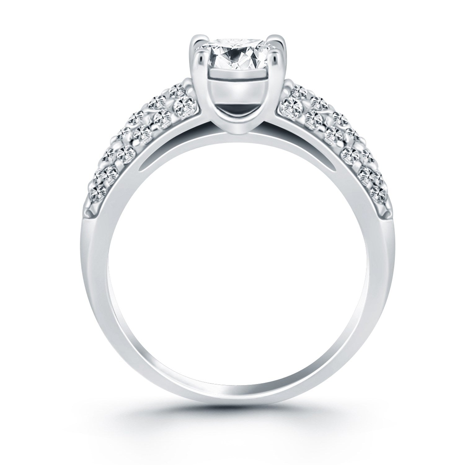 This dramatic ring is encrusted with three rows of glittering pave diamonds. The classic cathedral silhouette is amplified by the impressive width which culminates into a graceful taper. Expertly crafted in 14k white gold, the center highlights a sparkling 1/2 carat round cut diamond.