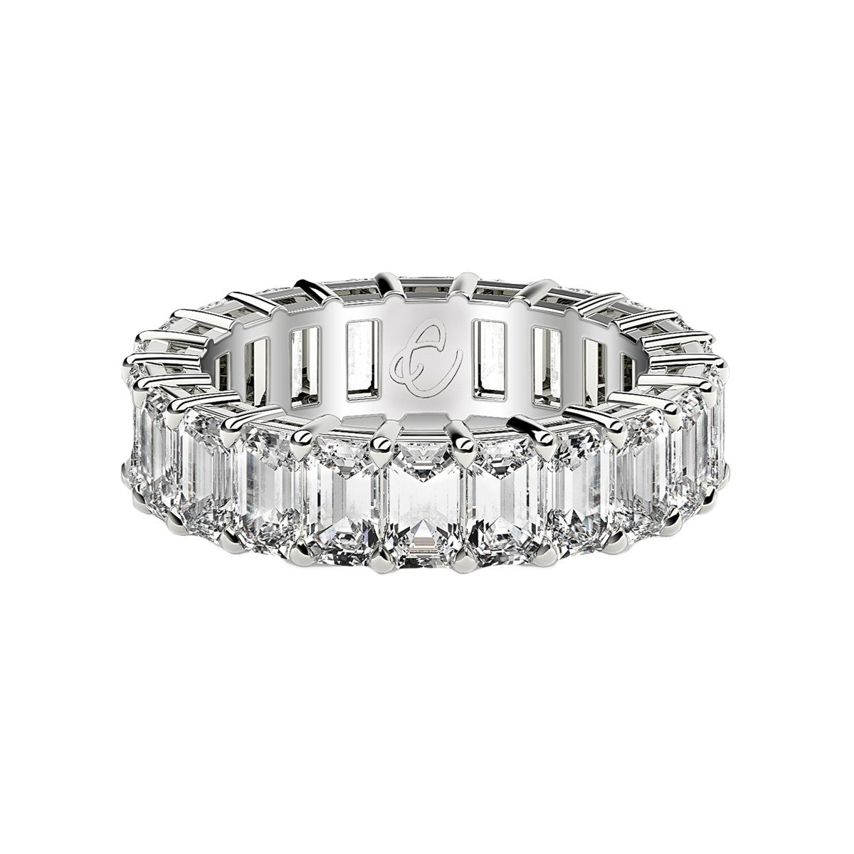 This dramatic eternity band features the traditional shine of 14k white gold, and the unparalleled sophistication of beautiful prong-set emerald cut lab grown diamonds. The light it radiates is as eternal and bright as the emotion it symbolizes. This ring belongs to the Eternity Us collection.